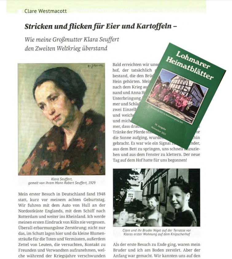Clare Westmacott hat für die neueste Ausgabe der Lohmarer Heimatblätter darüber geschrieben, wie Klara in der Kriegszeit ihre Bekanntschaften und Freundschaften auf den Höfen im Bergischen Land nutzte, um sich und ihre Familie durch Arbeiten aller Art mit Lebensmitteln zu versorgen. Nach dem Krieg hat Klara auf einem der Höfe in Lohmar gelebt und ist dort 1972 gestorben. Das Buch, das auch viele andere sehr lesenswerte Beiträge enthält, ist direkt beim Heimatverein zum Preis von 14,50 Euro zu beziehen.